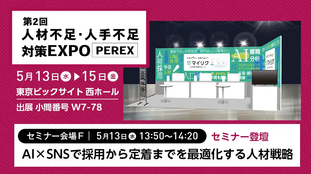 本展示会では、特許取得済みのHRマーケティングツール「マイリク」を展示。深刻な人材不足を背景に、AIとLINEを活用して「採用の最大化」と「離職の最小化」を同時に実現する最新のソリューションを、実機デモンストレーションとともにご紹介いたします。 |