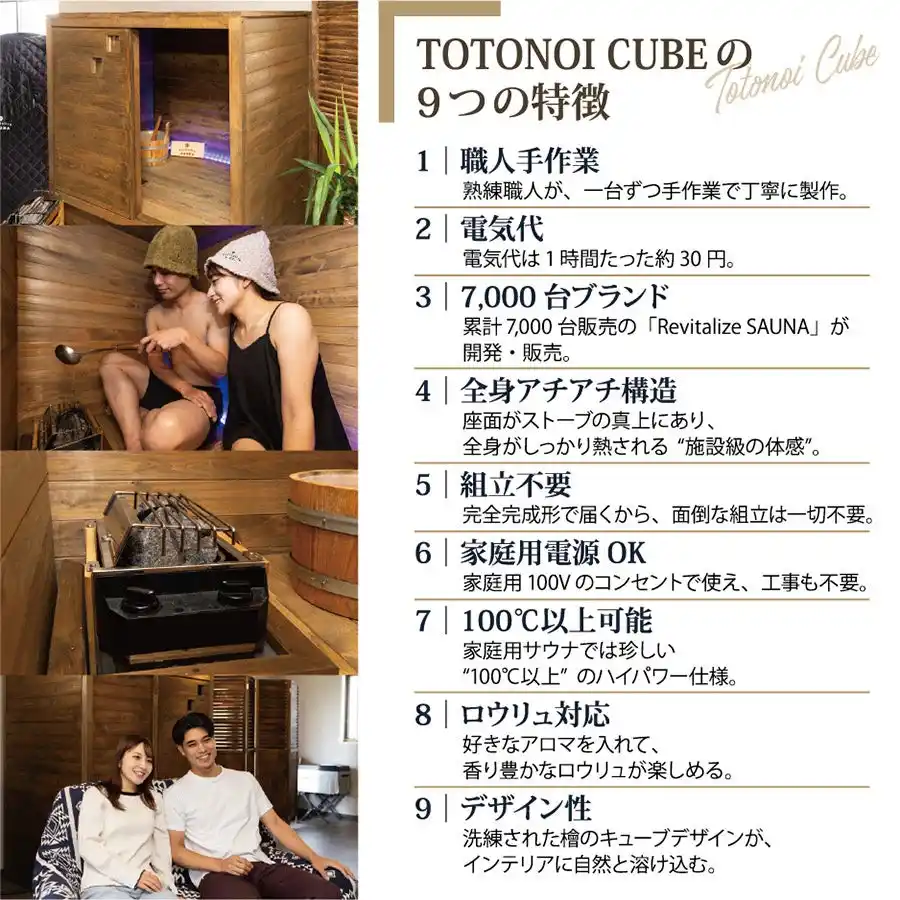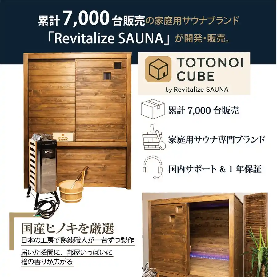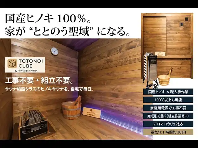 工事不要・100V電源で使用できる新商品「TOTONOI CUBE」を発表しました。 近年のサウナブームと在宅時間の増加を背景に、自宅で本格的に“ととのう”需要が高まっています。 同製品は従来の課題であった「価格・設置・電気代」を解決した新モデルです。 公式サイトにて販売を開始いたします。 |