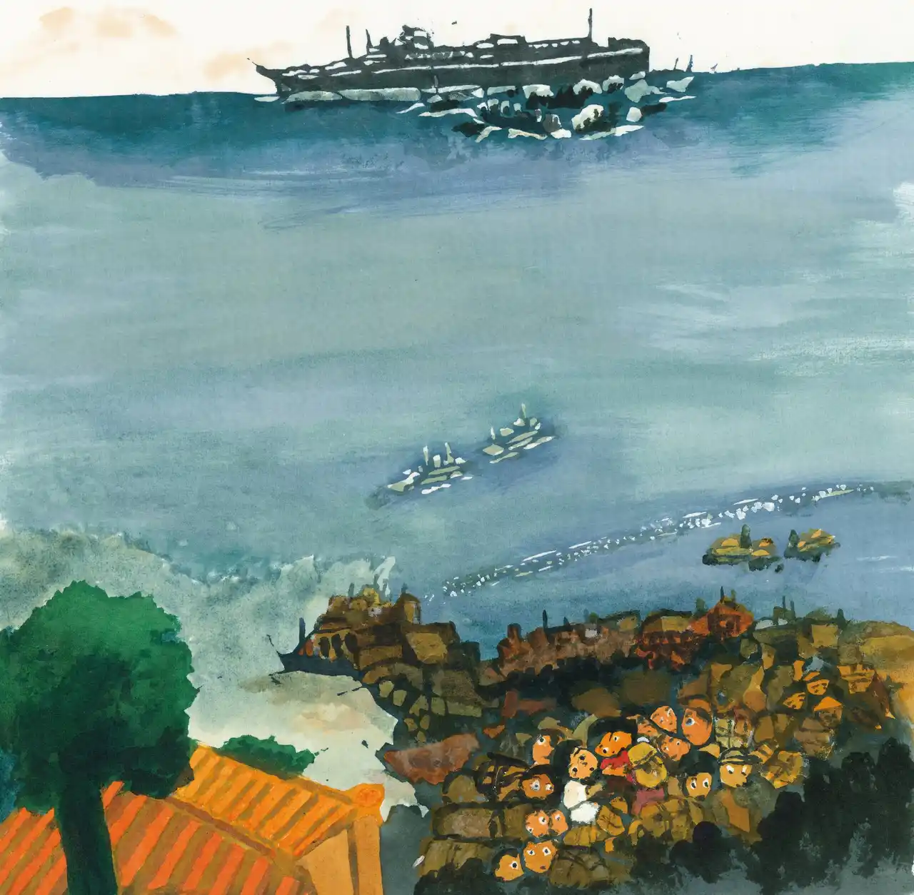 沖縄にせめてくるアメリカ軍から逃れるため、老人や子どもは日本本土へ疎開することになりました。ひろ子は、大きな輸送船、対馬丸にたくさんの人たちと乗り込みますが、アメリカ軍から魚雷攻撃をうけ、沈んでしまいます。 |