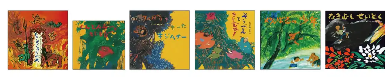 左から『じごくのそうべえ』(1978年)『とんとんみーときじむなー』(1987年)『てっぽうをもったキジムナー』(1996年)、『そうべえときじむなー』(2018年)やんばるの少年』(2019年)『なきむしせいとく』(2022年) |
