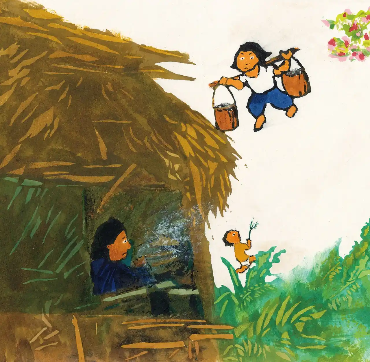 市場で売るとうふを作るアンマー(お母さん)のために、海の水をくんでニガリを作る手伝いをする主人公。(『ガージュー先生』P1より) |