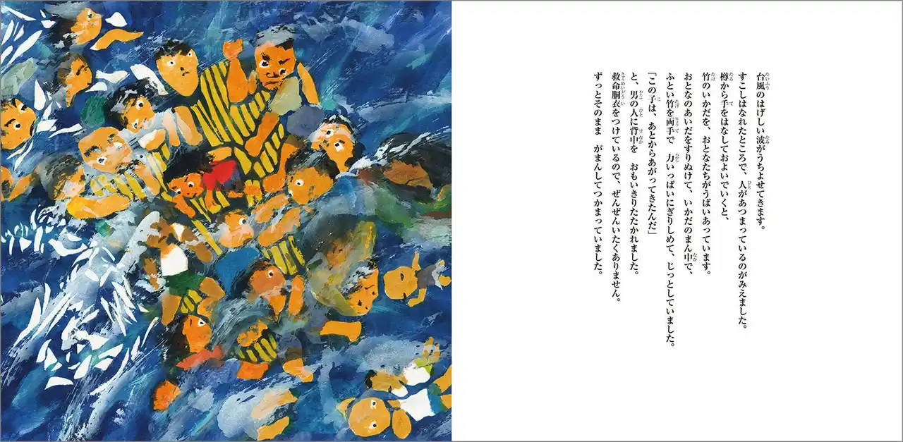 船が撃沈され、海を漂流する人々。竹のいかだを大人たちがうばいあっていた。(『ガージュー先生』P14-15より) |