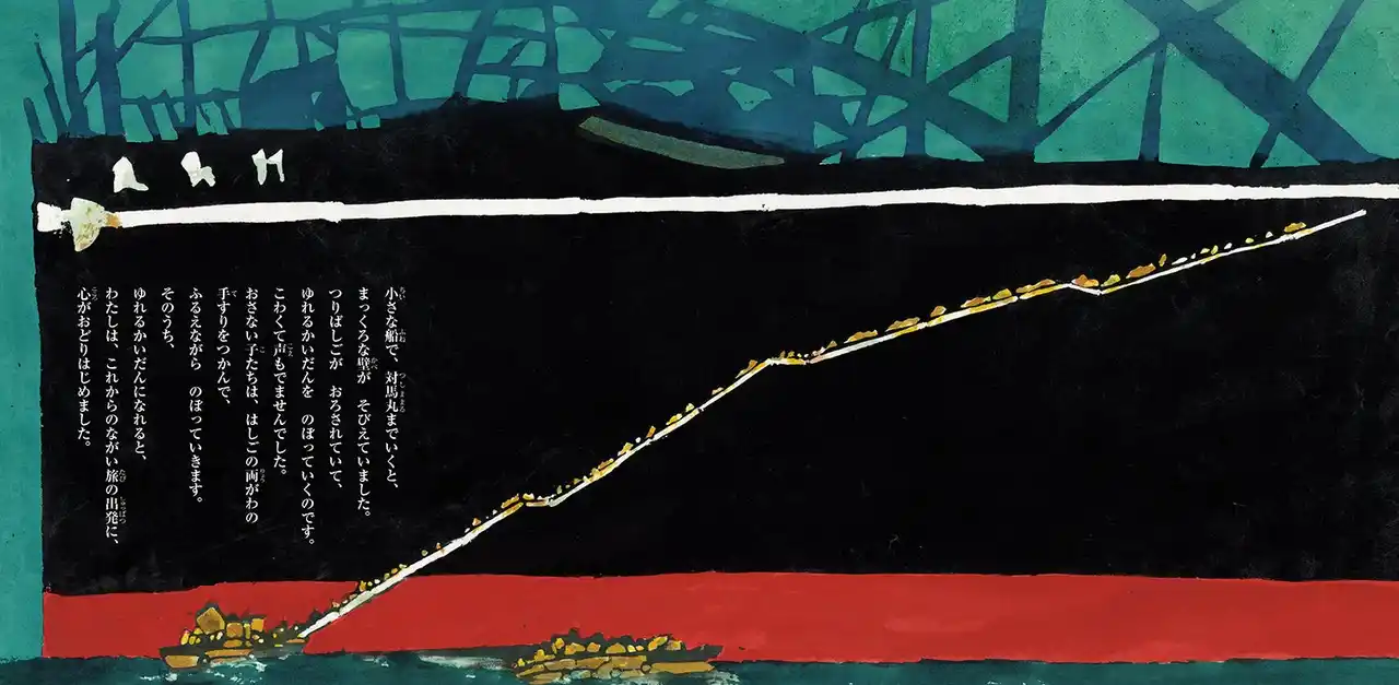 那覇港から小さな船で、沖に停泊する大きな対馬丸に乗り替えるひろ子たち。吊りはしごが下ろされ、ゆれる階段をのぼっていく。(『ガージュー先生』P8-9より) |
