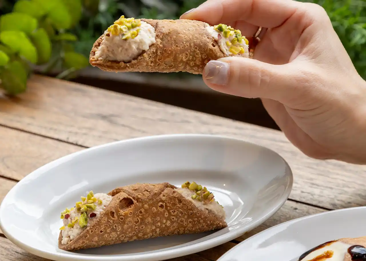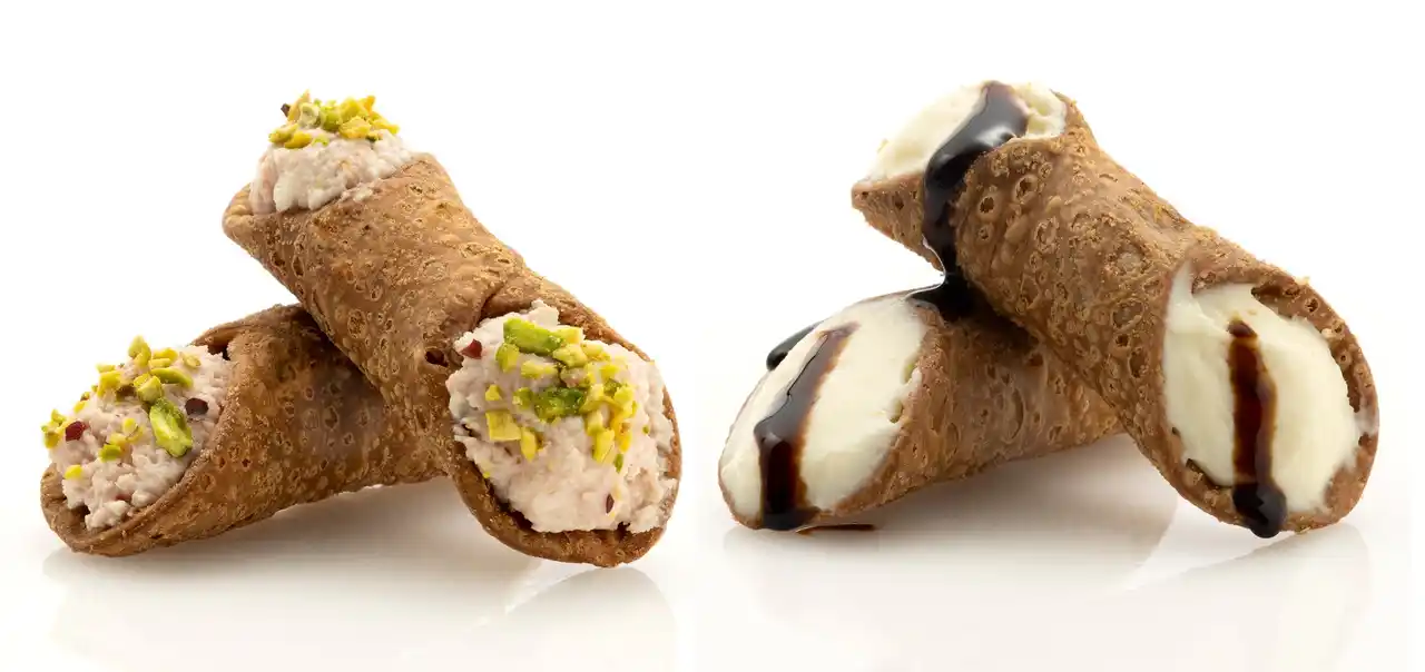 シチリアを代表する伝統菓子カンノーロにサラート(塩味)のクリームをたっぷりつめたお酒にもあう一品です。2種類の味からお選びください。 |