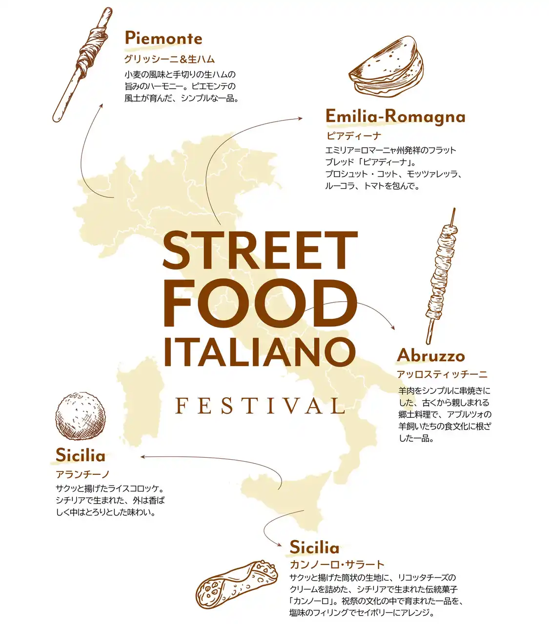 ピアディーナ(エミリア・ロマーニャ州)、アッロスティッチーニ - 羊の串焼き(アブルッツォ州)、グリッシーニ&生ハム(ピエモンテ州)、アランチーノ(シチリア州) |