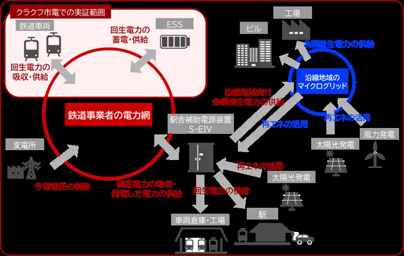 新サービスは、ESSで回生エネルギーの余剰電力(余剰回生電力)の有効活用を行うもので、本実証は、ポーランドのクラクフ市で市電やバスを運営するMiejskie Przedsiębiorstwo Komunikacyjne S.A. w Krakowie(ミエイスキエ・プシェドシェンビオルストフォ・コムニカチィネ・エス・アー・ヴ・クラコヴィエ、本社:ポーランド共和国クラクフ市、以下、MPK社)と同市道路管理局 Zarząd Drog Miasta Krakowa(ザジョンド・ドルッグ・ミアスタ・クラコヴァ、本社:ポーランド共和国クラクフ市、ZDMK社)の協力のもと、当社および当社関係会社MEDCOM Sp. z o.o.(メドコム、本社:ポーランド共和国マゾフシェ県、以下、MEDCOM)が実施するものです。 |