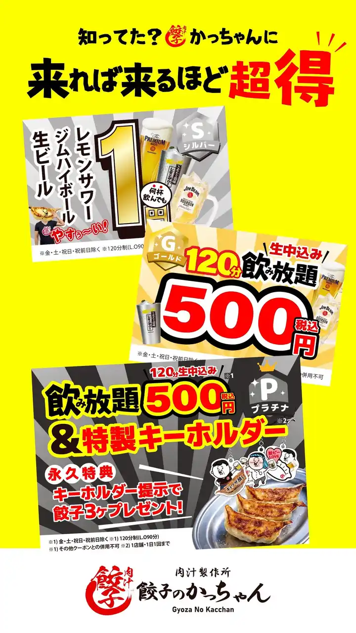 ランクアップの条件は「1日1回のチェックイン」。かっちゃんは圧倒的なコスパを誇るため、本命の飲み会前の「0次会」や、少し飲み足りない時の「2次会」として、お友達や同僚とサクッと立ち寄るのに最適です!休日の早い時間から気心知れた仲間と「昼飲み」で餃子をつまむだけでも、立派な1回としてカウント。いつもの集まりの前後に気軽にかっちゃんをご利用いただくことで、無理なく自然とランクアップに近づくことができます。 |