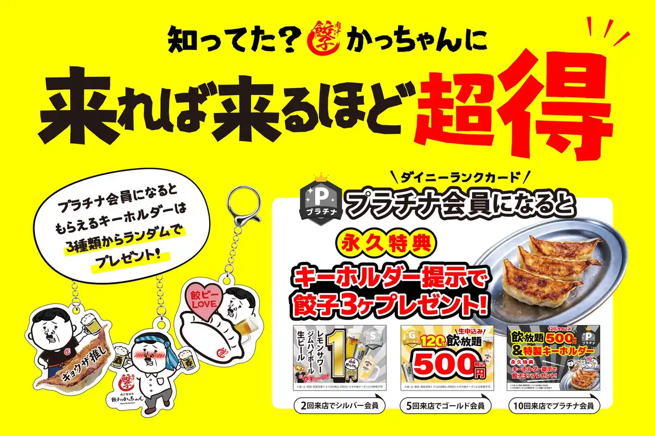 株式会社double(本社:大阪府大阪市北区/代表取締役:松井 勝也)が展開する“肉汁製作所 餃子のかっちゃん”は、いつもお店を盛り上げてくださる常連様はもちろん、これから初めてご来店いただくすべてのお客様へ「圧倒的な還元とワクワク」をお届けするため、来店するたびに次々と豪華特典が解放される新感覚の「ランクカード制度」を、2026年5月1日(金)より全店舗にて本格導入します。 |