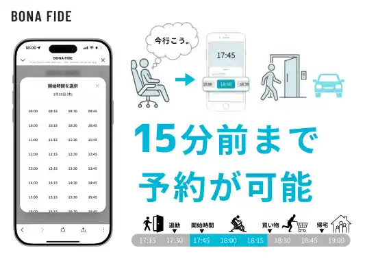 ・15分刻みの柔軟な予約設計 ・直前15分前まで予約可能 ・直前でもワンタップで前後30分まで変更OK |