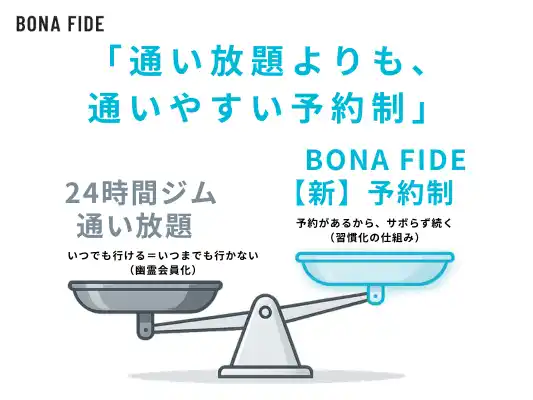 しかしボナファイドジムは、 その“予約制=不便”という常識に対し、 自社開発の予約システムにより、逆転のアプローチを実現しました。 |