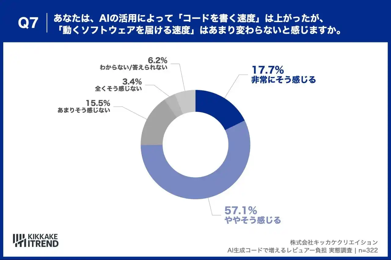 株式会社キッカケクリエイション(本社:東京都渋谷区、代表取締役:川島 我生斗)は、業務でコードレビューを担当してるITエンジニア322名を対象に、AI生成コードのレビュアー負担に関する調査を実施しましたので、お知らせいたします。