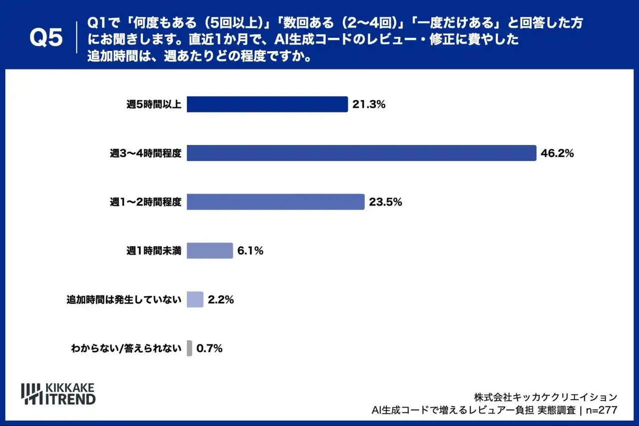 「Q5. Q1で「何度もある(5回以上)」「数回ある(2~4回)」「一度だけある」と回答した方にお聞きします。直近1か月で、AI生成コードのレビュー・修正に費やした追加時間は、週あたりどの程度ですか。」(n=277)と質問したところ、「週5時間以上」が21.3%、「週3~4時間程度」が46.2%という回答となりました。 |