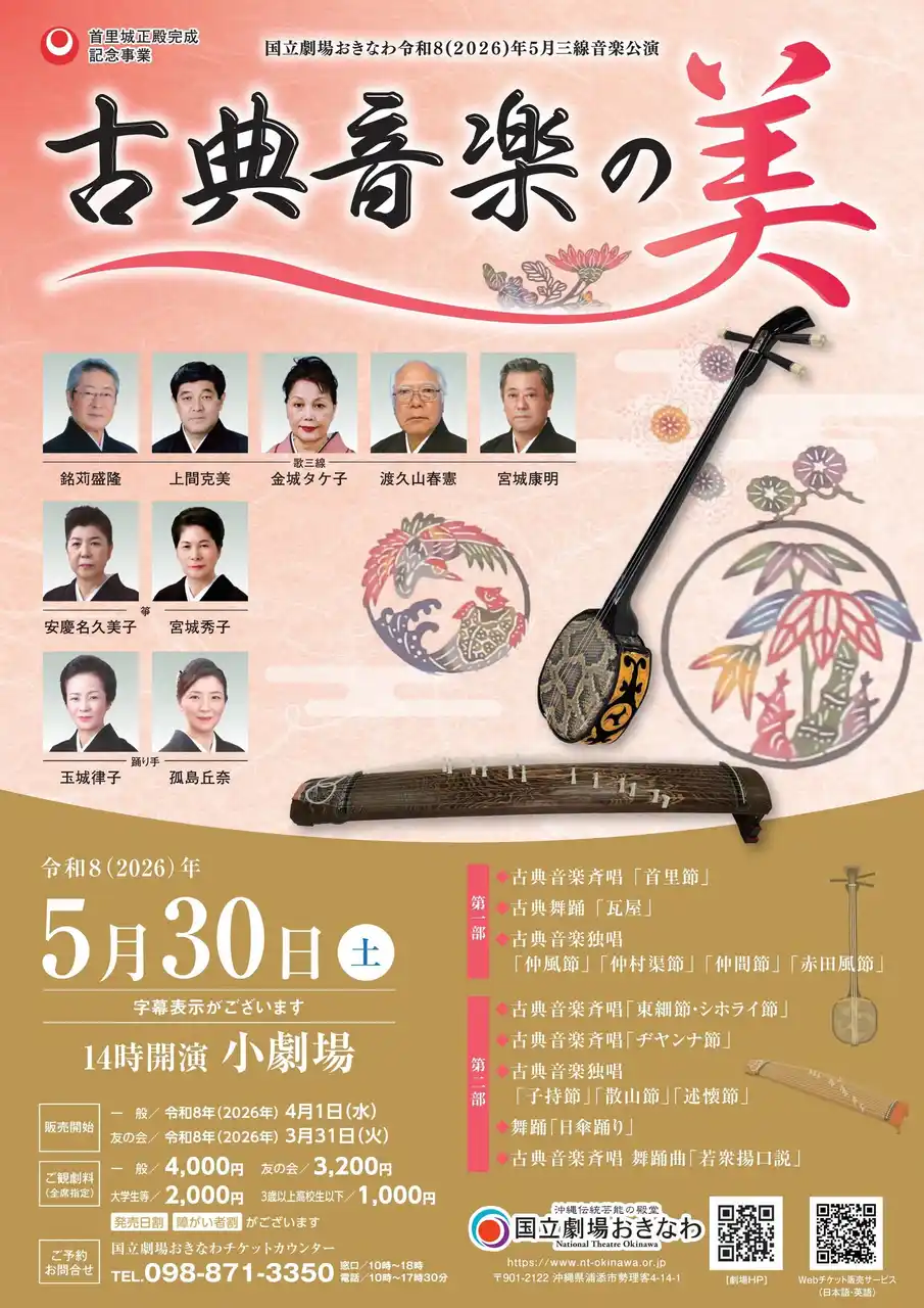 琉球古典音楽の魅力を存分に堪能できる本公演。なかでも代表的な独唱曲や斉唱曲、舞踊曲など多彩な演目で古典音楽を楽しんでいただきます。第一部は、若手による古典音楽の斉唱、女性地謡による舞踊曲、そして、現在第一線で活躍される古典音楽保持者による、味わい深い独唱曲を披露いたします。第二部は若手女性演奏家による斉唱や、湛水流の斉唱、箏曲のみによる舞踊地謡など、古典音楽の世界をご堪能ください。 |