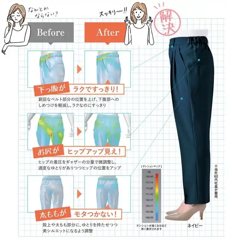 | 大人世代体型の3大悩みに寄り添い、仕上げ寸法は大きく変えず数値上では測れない部分にこだわったパターンで仕上げました。きれいなシルエット&はき心地のよさを体感していただきたいです。 | |||||||||