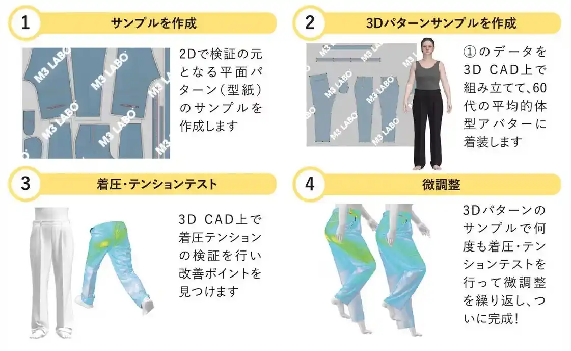 | 繊維専門商社モリリン株式会社のデジタルチーム<M3 LABO(R)>との共同開発で、3Dデジタル技術を活用して、60代女性のお悩みを解決するパンツを作りました。 |