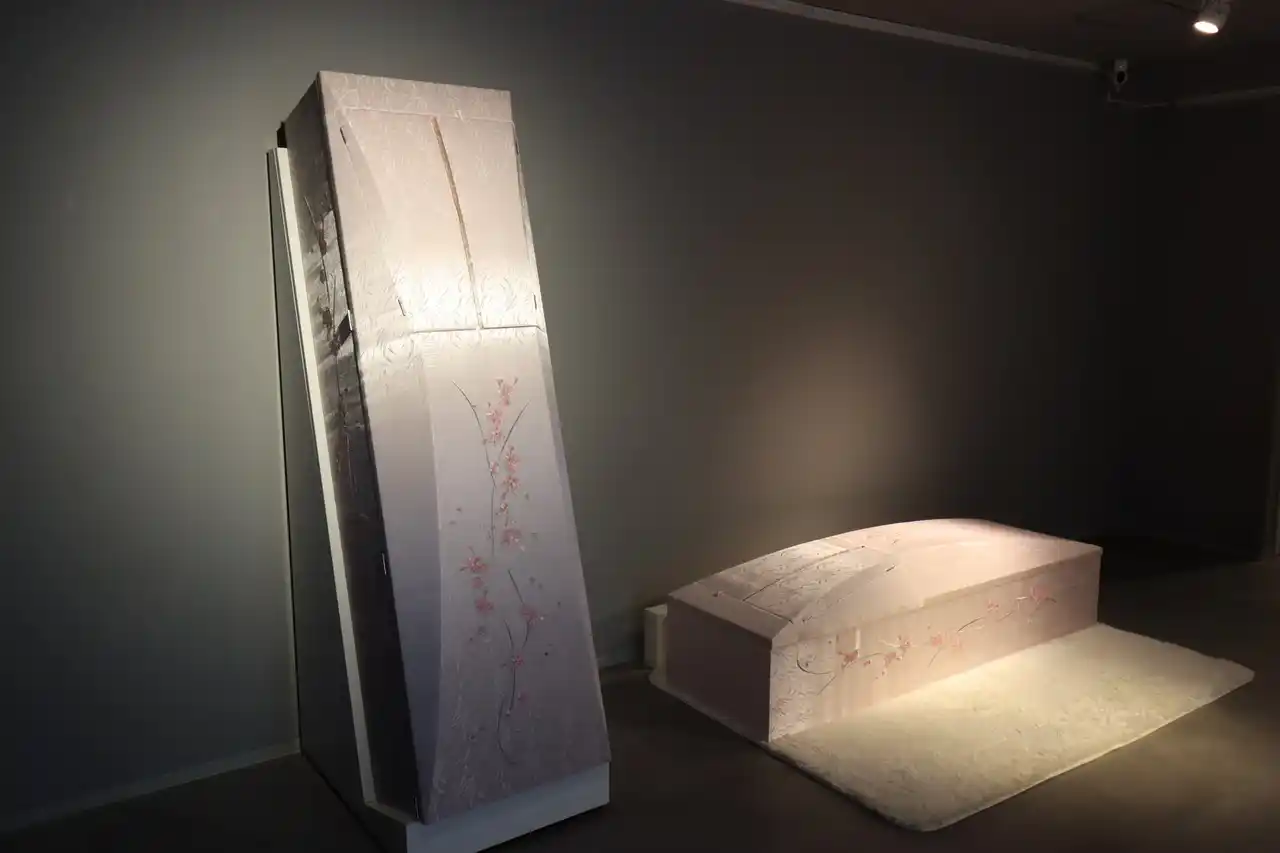 骨壺は「特別な場所に置くもの」、「日常とは距離のある存在」と捉えられることが多い葬祭用品です。本展では遺骨を納めるための道具という機能を超え、日々の暮らしを豊かに彩る鑑賞の対象となるような、アート作品としても楽しむことのできる新しい骨壺を揃えました。仏間に限らず、リビングや書斎といった場所にも馴染む佇まいを備えた骨壺は、鑑賞者に死と向き合う時間を生み出し、今を前向きに生きることへの意識を促します。 |