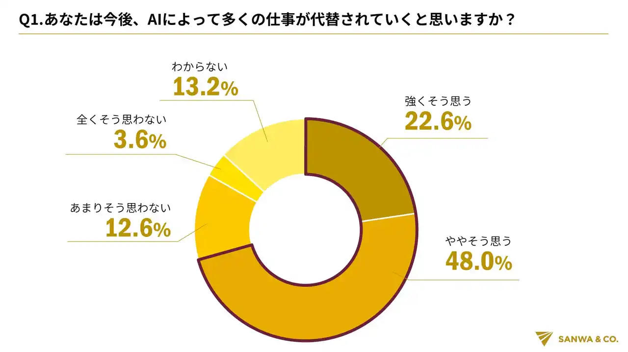 AIが多くの仕事を代替していくかを問う設問では、「ややそう思う」(48.0%)と「強くそう思う」(22.6%)の合計が70.6%に上るなど、AIによる仕事の代替が進むと捉えていることがわかりました。 |