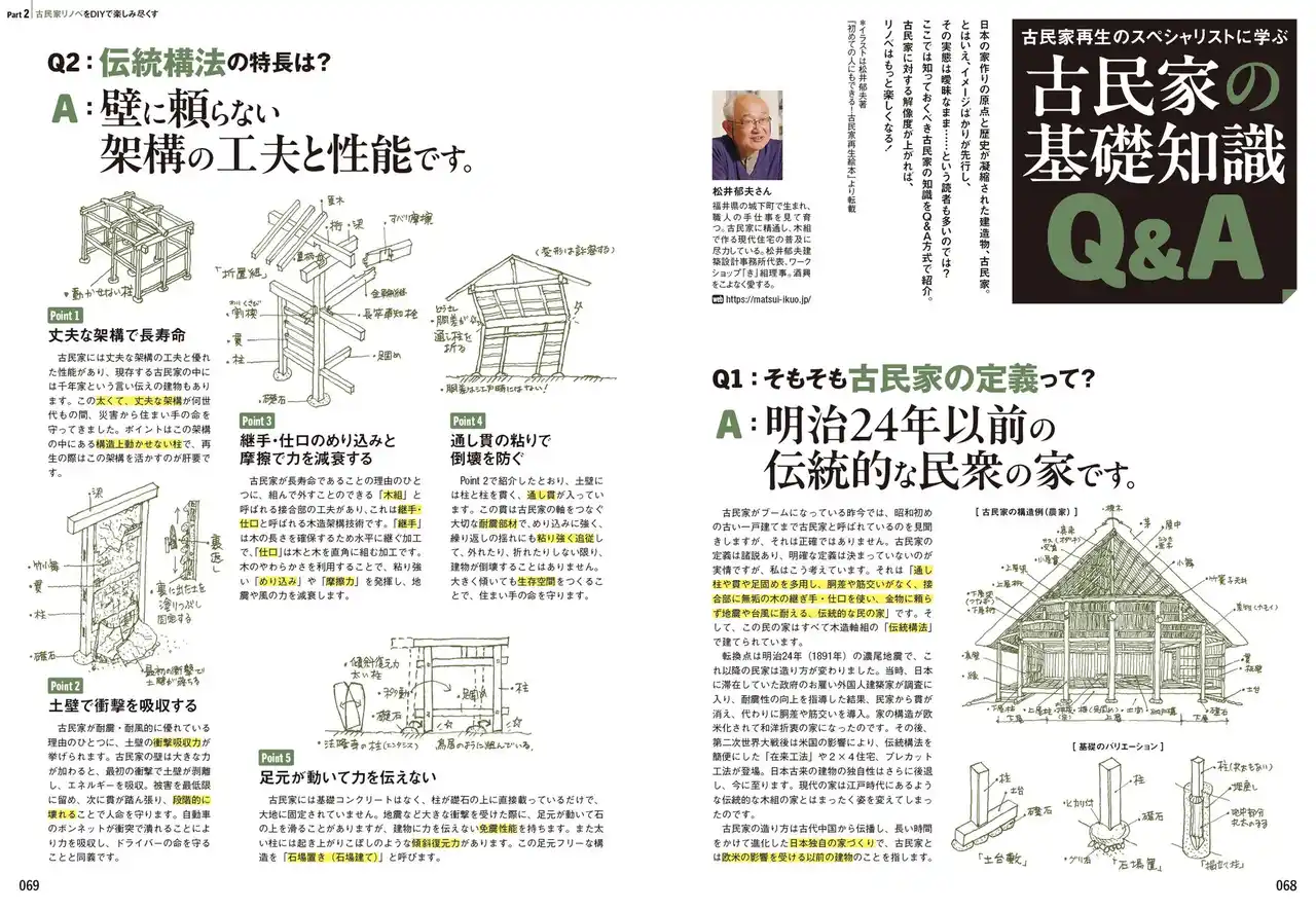 日本の家作りの原点と歴史が凝縮された建造物、古民家。失われつつある現代の建築遺産でもある古民家をDIYリノベという角度から徹底解剖。その定義をはじめ、物件購入のコツから、壊し方、直し方、断熱方法まで……古民家リノベの秘訣を余すことなく公開。また再生した古民家による民泊開業や賃貸営業にもズームイン。自分らしい暮らし方と働き方を両立する、リノベビジネスの魅力にも迫ります。 |