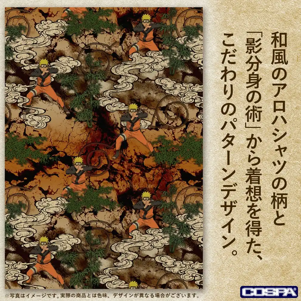 ・和風のアロハシャツの柄と「影分身の術」から着想を得た、こだわりのパターンデザイン。 |