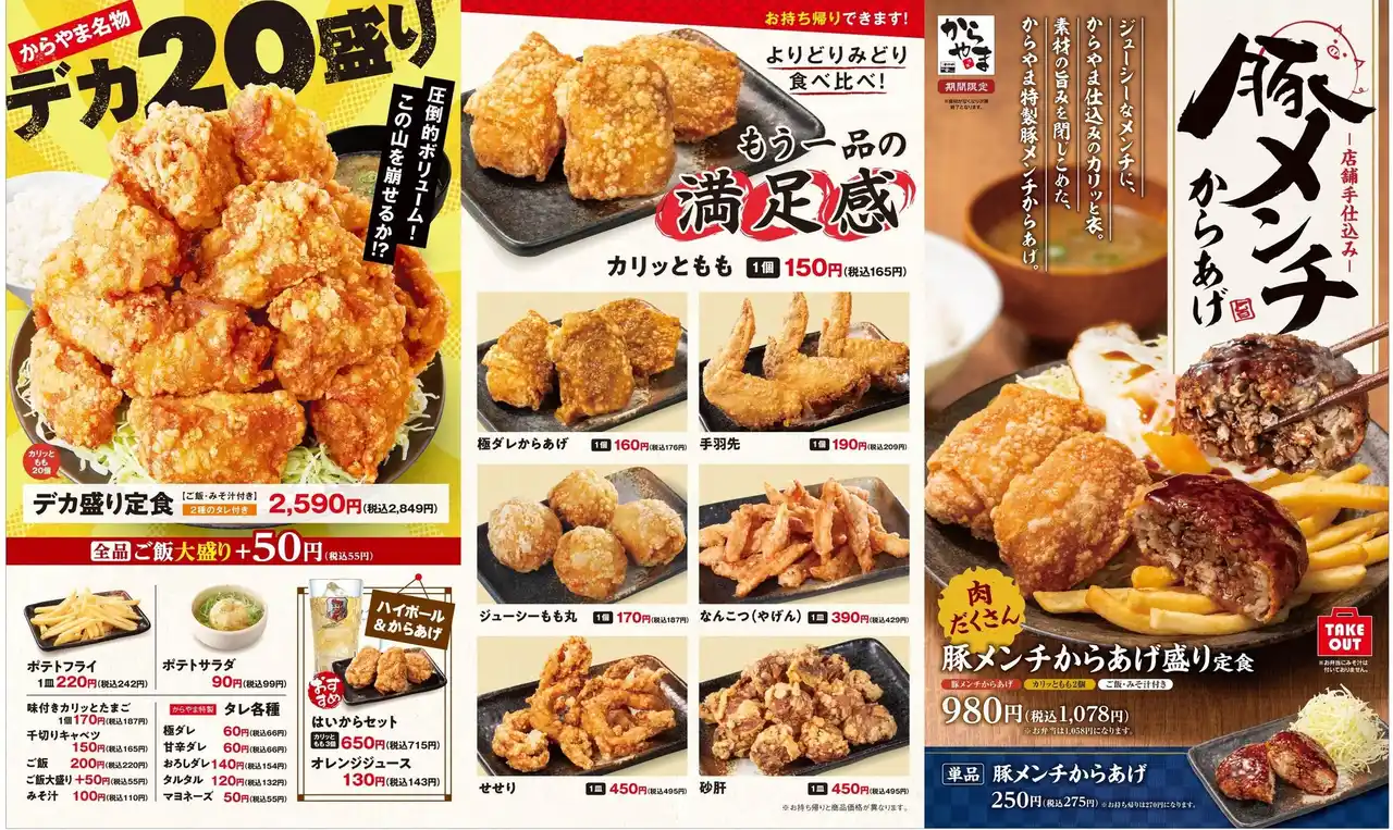 粗挽きの豚肉を使用したメンチからあげは、噛んだ瞬間にあふれるジューシーな肉汁と、旨みの詰まった濃厚な味わいが特長。 そこに、からやま自慢のからあげと目玉焼き、ポテトフライを一緒に組み合わせた、ボリューム満点の一品です。 |
