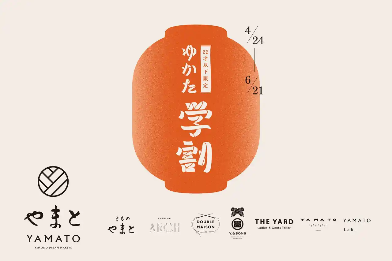 きもの専門店やまとが展開する各ブランドでは、2026年4月24日(金)より「ゆかた学割」キャンペーンを実施いたします。本キャンペーンでは、「きものやまと」「KIMONO ARCH」「Y. & SONS」「THE YARD」など、やまとの全ブランドで展開するゆかたが、新作を含めて全品20%OFFでお求めいただけます。 |