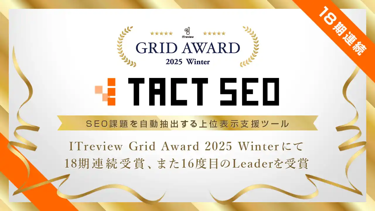 | 株式会社ウィルゲート(本社:東京都港区、代表取締役:小島 梨揮、以下「ウィルゲート」)が提供するAI×SEOツール「TACT SEO」は、アイティクラウド株式会社(本社:東京都港区、代表取締役社長 兼 CEO:黒野 源太)が主催する「ITreview Grid Award 2026 Spring」の「SEOツール」部門において、認知度とユーザー満足度が優れているサービスに贈られる「Leader」を受賞したことをお知らせいたします。今回でSEOツール部門は23期連続受賞、「Leader」の受賞は21度目(※1)となります。 | |||