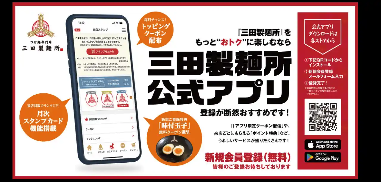 三田製麺所をもっとお得に楽しむなら、アプリ登録が断然おすすめです。 |