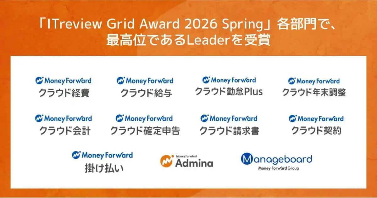 | マネーフォワードグループが提供する11プロダクトが、アイティクラウド株式会社主催「ITreview Grid Award 2026 Spring」の各部門にて、最高位である「Leader」を受賞しました。今回受賞したプロダクトは、株式会社マネーフォワードのバックオフィスSaaS『マネーフォワード クラウド』の8プロダクト、マネーフォワードケッサイ株式会社の企業間後払い決済・請求代行サービス『マネーフォワード 掛け払い』、マネーフォワードi株式会社の情シス向け業務OS『マネーフォワード Admina』、マネーフォワードコンサルティング株式会社の経営管理プラットフォーム『Manageboard』です。 | |||