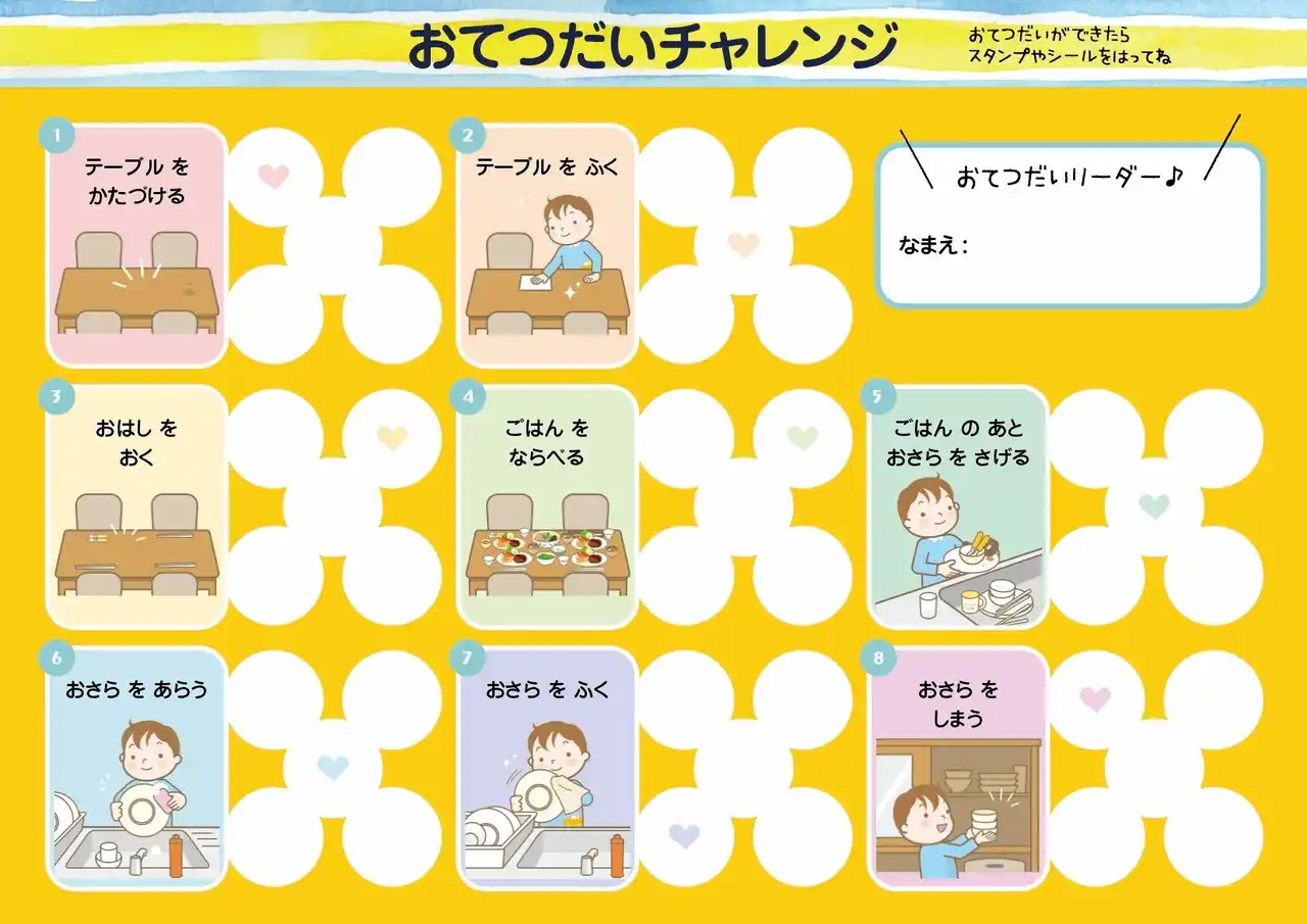 食器洗いを中心とした、家庭におけるお手伝いのチャレンジを記録するシート。子どもたちの「できた!」という達成感を大切に、家庭におけるお手伝いの習慣化を後押しいたします。 |