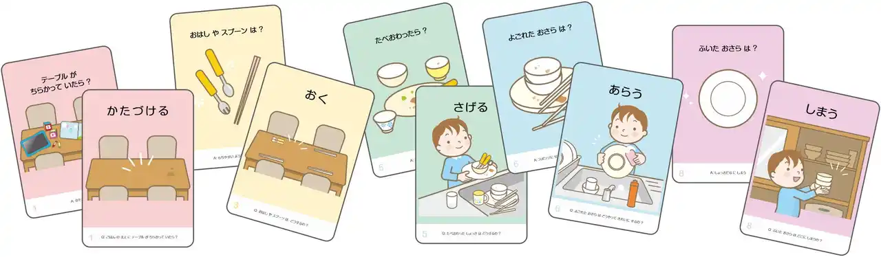 食前から食後までに行える「お手伝いの項目」をカードで提示。クイズ形式で学べる工夫を取り入れ、子どもたちのお手伝いへの興味を醸成します。 |