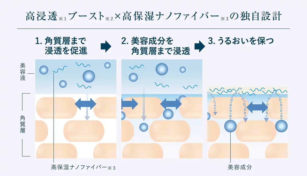 ・美容成分を角質層まで浸透させる「高浸透※1ブースト※2」と植物由来の保湿成分「高保湿ナノファイバー(ELLEX-C)」※3の独自設計。 |