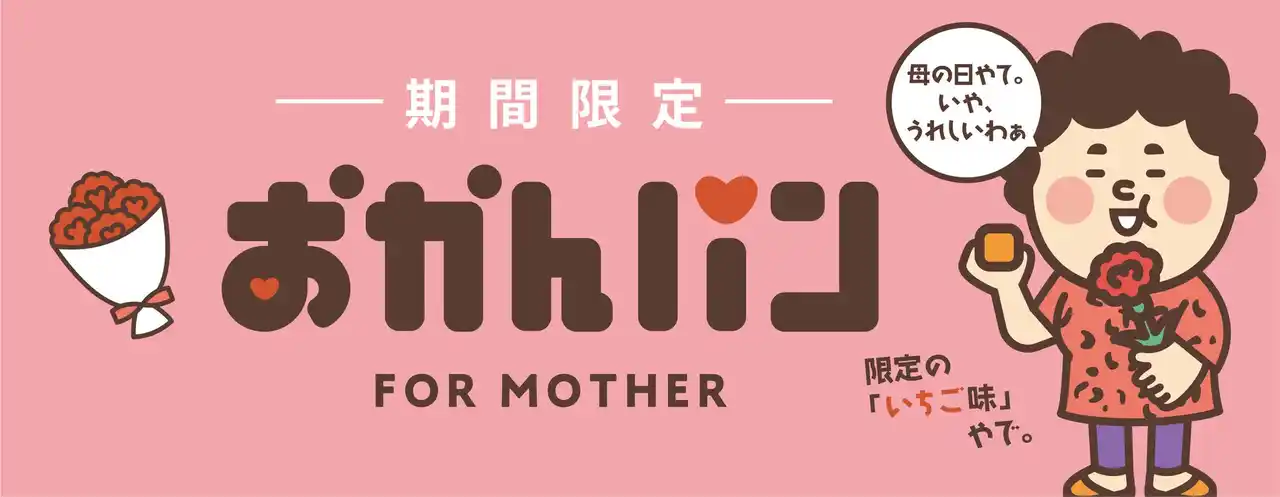 今回の「おかんパン(おかんの日)」は、カーネーションを手にしたおかんが描かれた母の日仕様の限定パッケージで登場します。 日頃照れくさくて言えない「いつもありがとう」の気持ちを、大阪らしいユーモアと共に伝えるのにぴったりな商品です。 |