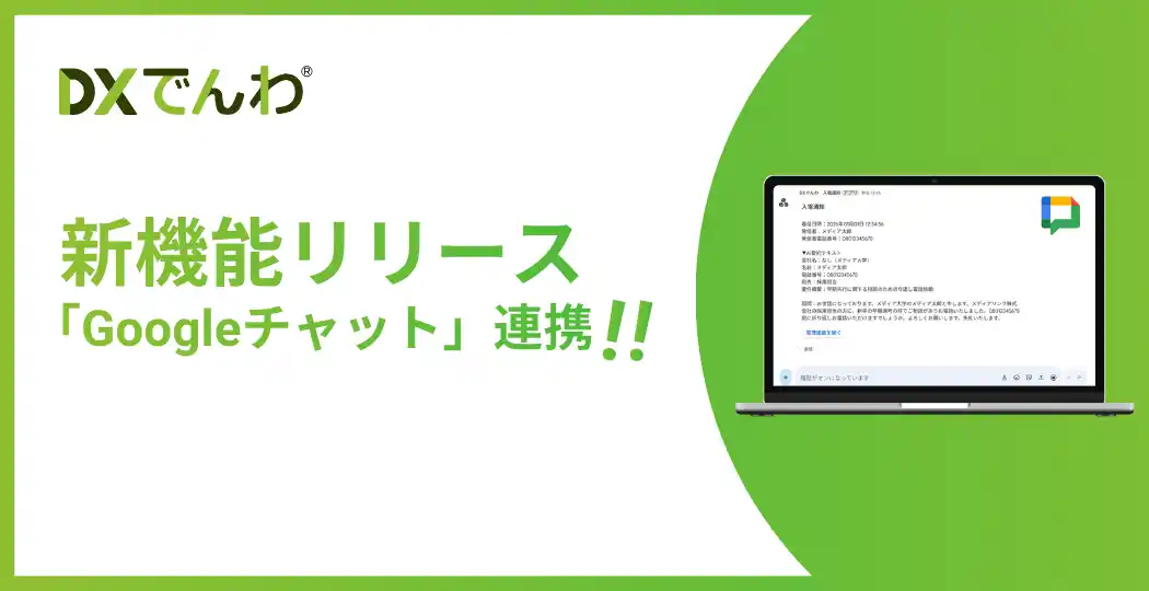 これまでも各種メールやチャットツールを入電時の通知先として設定できましたが、実際に「DXでんわ」を導入いただいているお客様からご要望をいただき、今回の「Googleチャット通知機能」を追加しました。 |