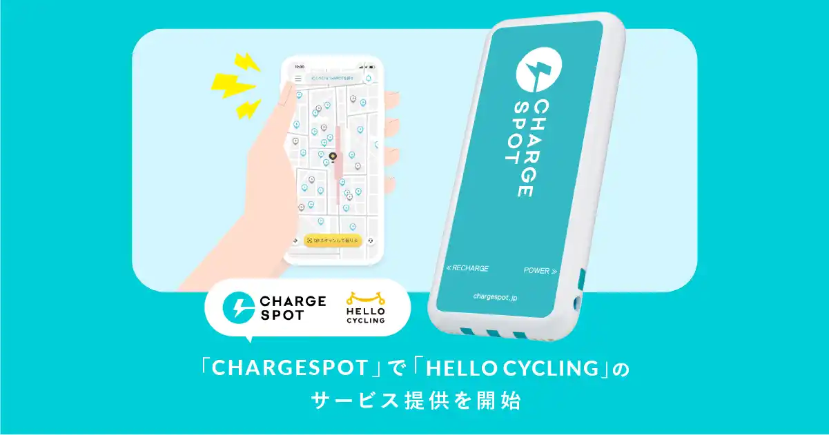 「CHARGESPOT」は、日本全国のコンビニ、駅、商業施設など約6万カ所に設置されている持ち運び可能なモバイルバッテリーのシェアリングサービスアプリです。今回のサービス提供開始により、「CHARGESPOT」ユーザーは新たに会員登録・決済方法を登録せずHELLO CYCLINGの自転車の解錠・返却までを「CHARGESPOT」アプリ内の「ShareSPOT」で完結できるようになります。 |