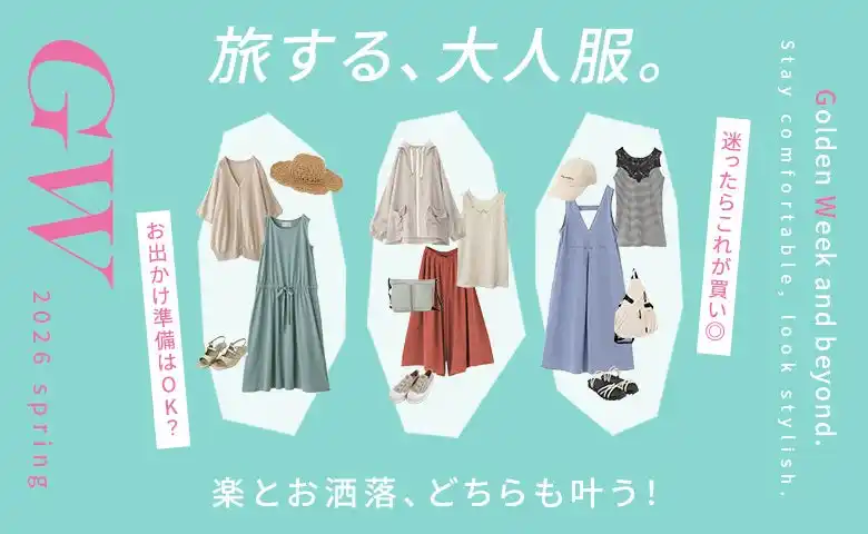 | 待ちに待ったゴールデンウィーク!久しぶりの遠出や、家族との穏やかな休日など、予定を立てるだけで心が弾む季節ですね。でも、いざ荷造りを始めると「移動中にシワにならない服は?」「写真に写るから体型もカバーしたい」と、着ていく服に悩んでしまうことも多いはず。本特集では、大人の女性が「失敗しない旅スタイル」を叶えるための厳選アイテムをご紹介します。長時間の移動も楽ちんなストレッチ素材、日差しから肌を守るUV対策アイテム、そして少ない荷物で印象を変えられる着回しアイテムまで。春らしい差し色やレース、刺繍のディテールを添えて、今のあなただからこそ似合う「気取らない華やかさ」を詰め込みました。 | |||||||||