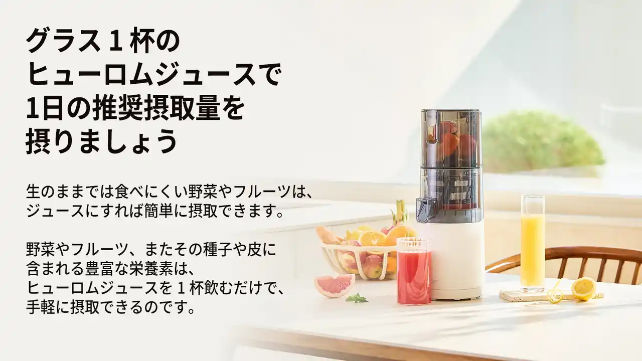 世界88の国や地域で展開するコールドプレスジューサーのパイオニア、HUROM株式会社(本社:東京都港区、以下ヒューロム)は、当社史上最少となるコンパクト設計のコールドプレスジューサー「Hurom E30ST」を、応援購入サービス Makuake(マクアケ) にて2026年4月21日(火)より先行販売を開始いたします。 |