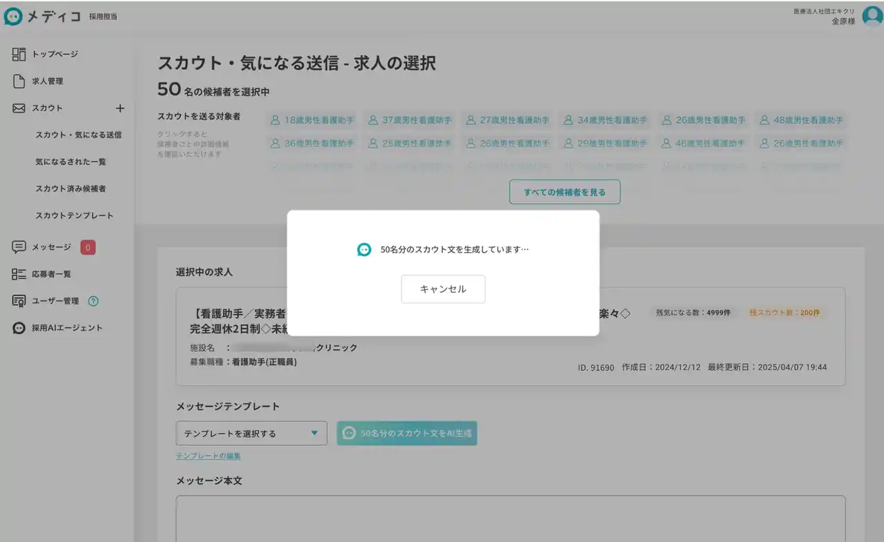 AI補助機能により、最大50名の候補者に対してスカウトをまとめて送信することが可能です。 候補者選定からメッセージ作成までをAIがサポートし、採用担当者の作業負担を軽減します。 |