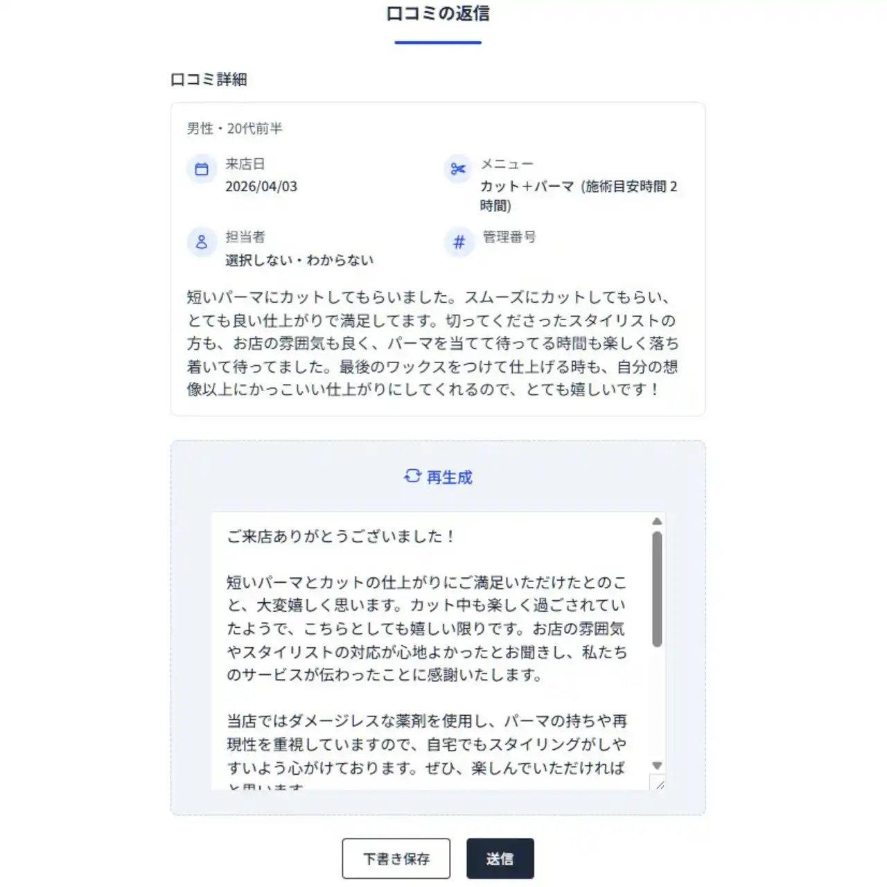 生成された返信文のニュアンスが「少し違う」と感じた場合は、ボタン一つで再生成が可能です。何度でもやり直せるため、サロンのトーンや温度感に合った返信文に仕上げることができます。 |