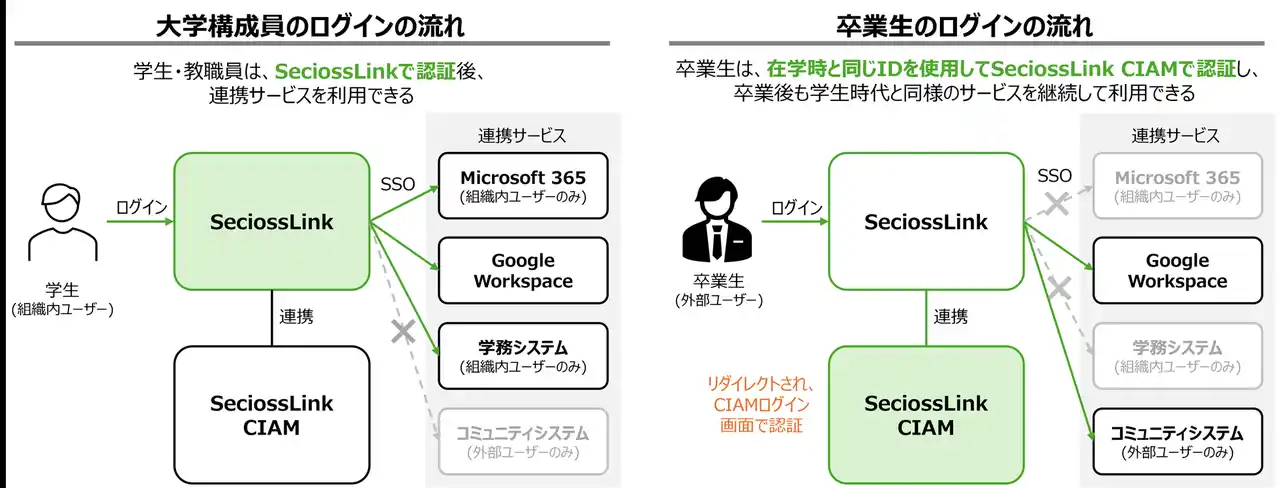 大学のユースケース。学生・教職員などの大学構成員(組織内ユーザー)は、SeciossLinkで認証後、連携サービスを利用できる。卒業生などの外部ユーザーは、在学時と同じIDを使用してSeciossLink CIAMで認証し、卒業後も学生時代と同様のサービスを継続して利用できる。 |