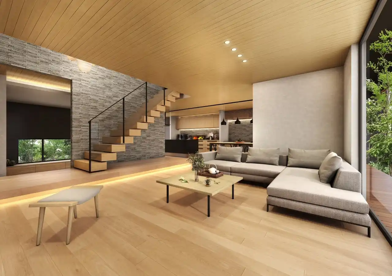 本展示場のインテリアデザインは、日本の伝統的な美意識と北欧のミニマルで機能的なデザインを融合したジャパンディ(Japandi)スタイル。 |