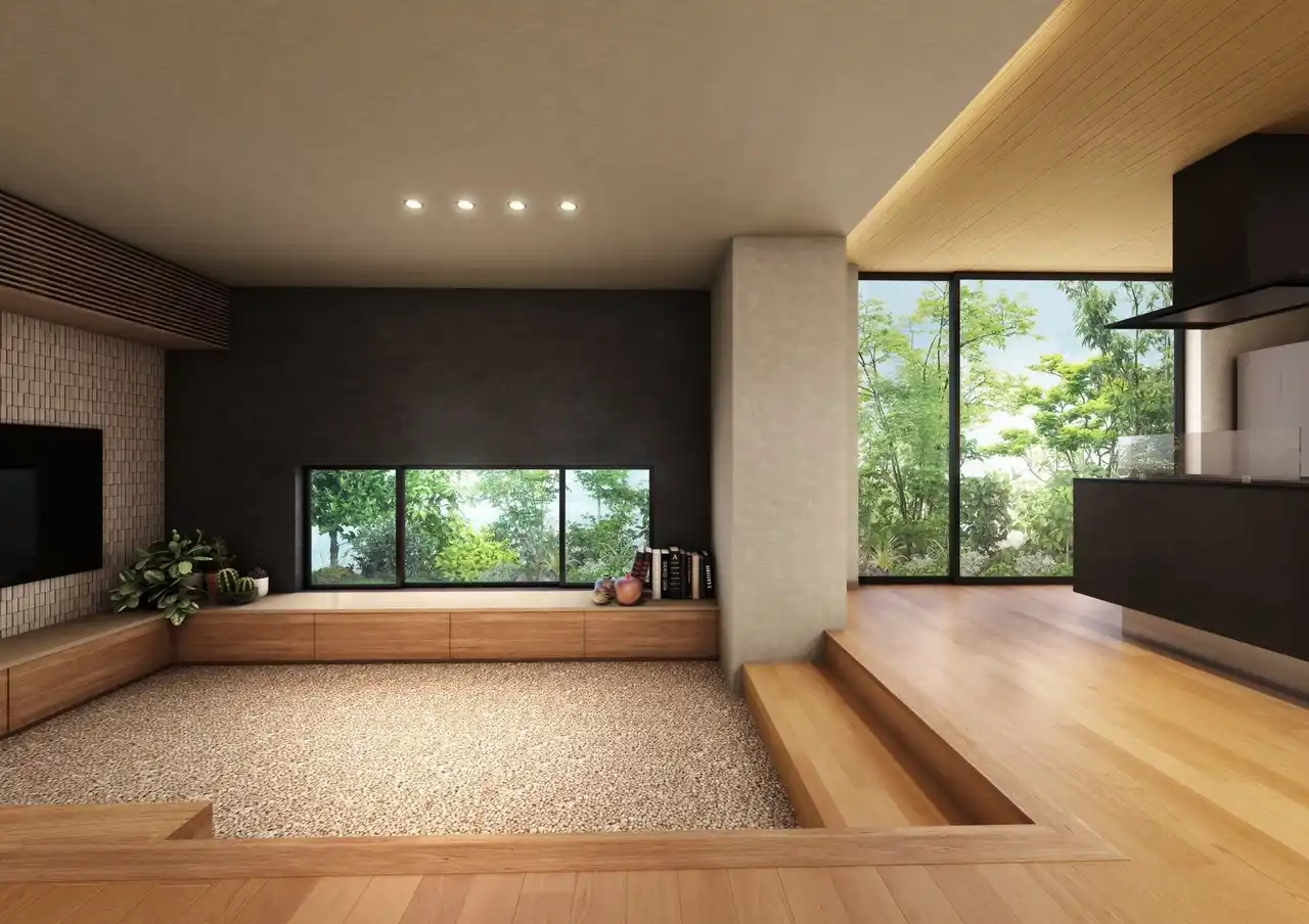 ダウンフロアリビング:包まれるような安心感 視線が自然と遮られ、落ち着きが生まれる。 家族が同じ空間にいながら、それぞれの時間を過ごせる“ゆるやかな分離” |