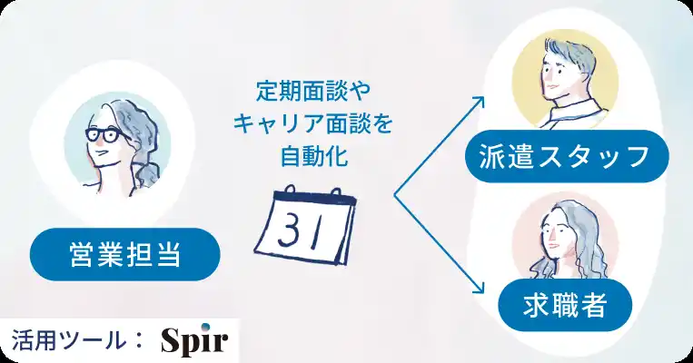 派遣スタッフ・求職者と営業担当の定期面談やキャリア面談も、求職者の個人情報保護に配慮したうえで自動化できます |