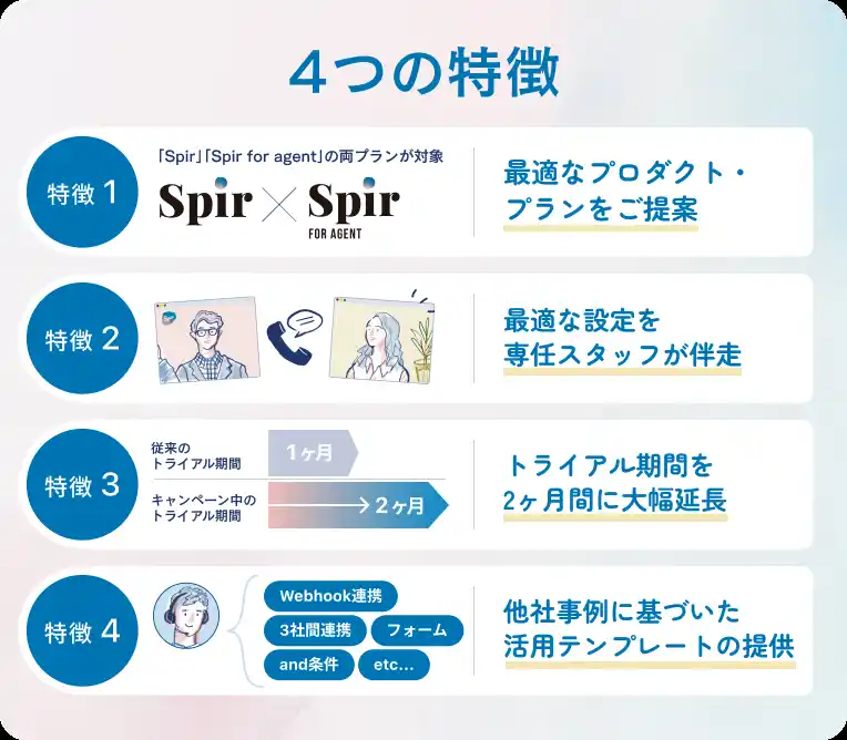 「Spir」「Spir for agent」の両プランが対象: 事業のご状況や業務フローに合わせ、最適なプロダクト・プランをご提案いたします。 |