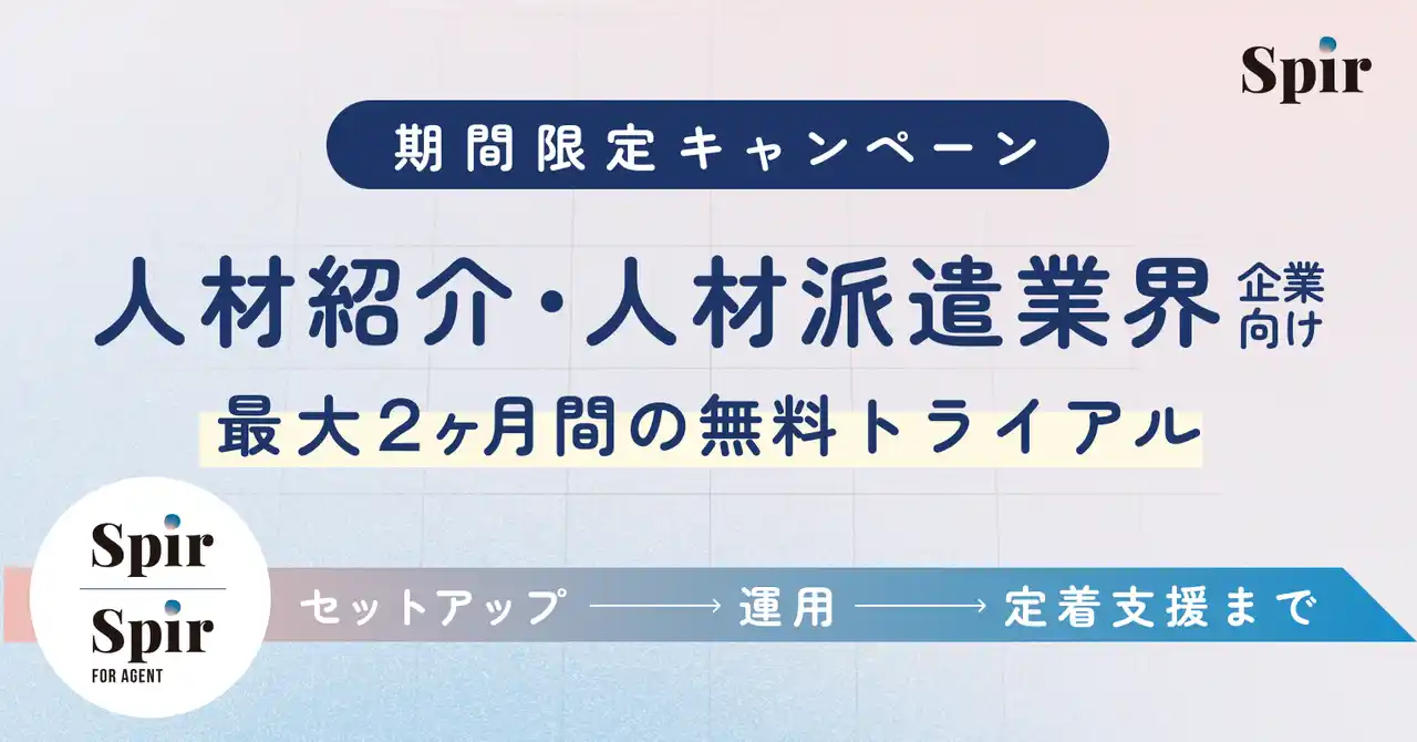こうした企業様への支援を通じ、「Spir」による業務効率化や面談設定率の向上に関する成功事例が数多く蓄積されてまいりました。 この成果をより多くのお客様にご提供するため、従業員50名以上の人材紹介・人材派遣・SES業界の企業様を対象に、個別セットアップから専任CSによる定着支援までをパッケージ化した期間限定キャンペーンを実施いたします。 |