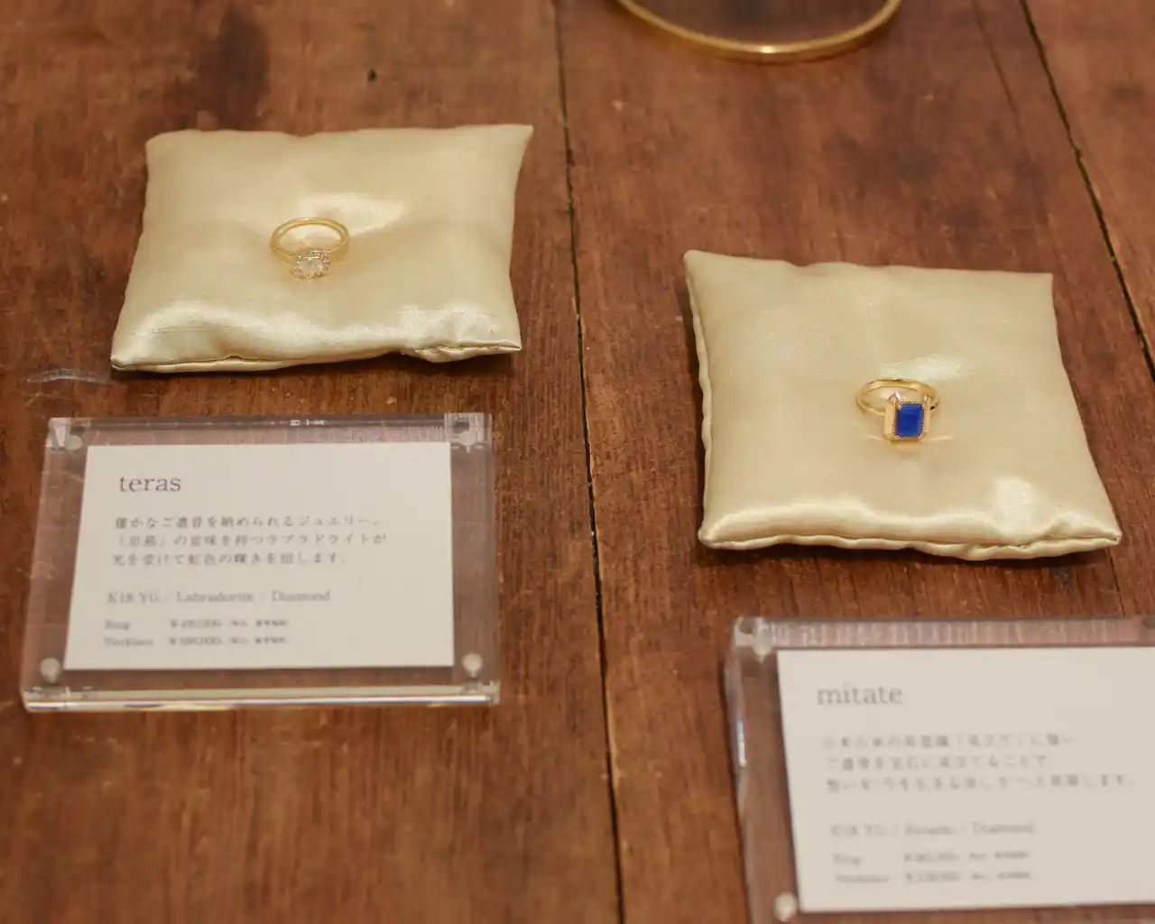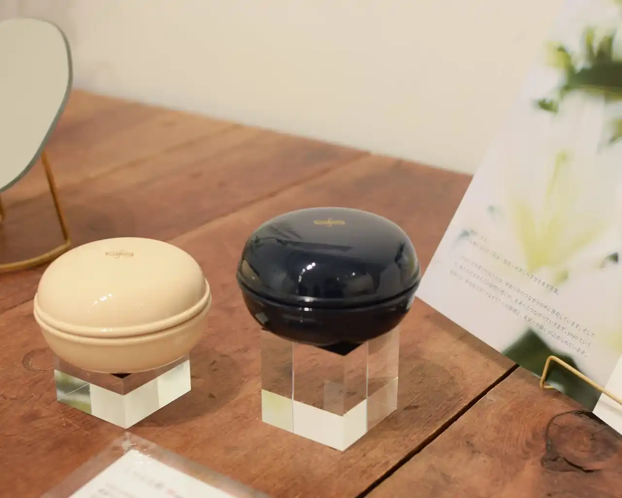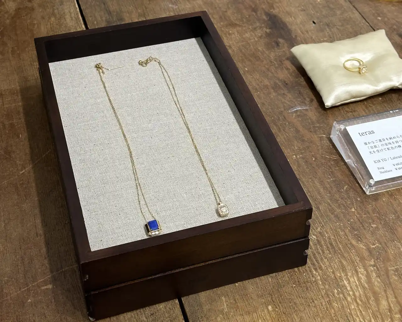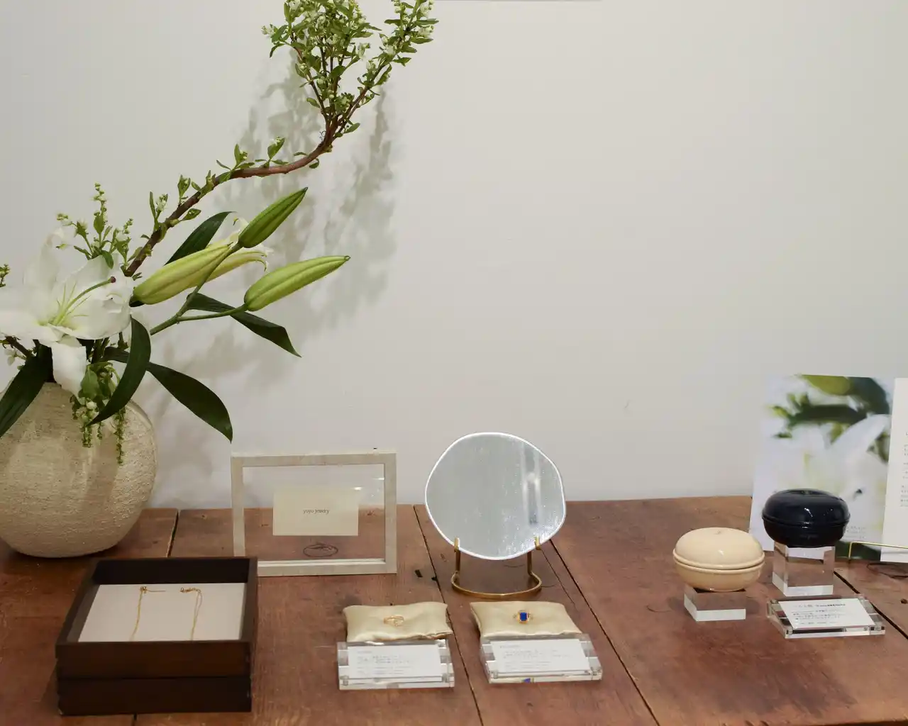 その先では「今」のyoyo jewelryを代表する手元供養アイテムをご紹介。「遺骨ジュエリー」や、漆塗り小箱「しつらえ箱」など、オンラインストアのみで展開しているアイテムを、実際に手に取ってご覧いただける機会となりました。 |