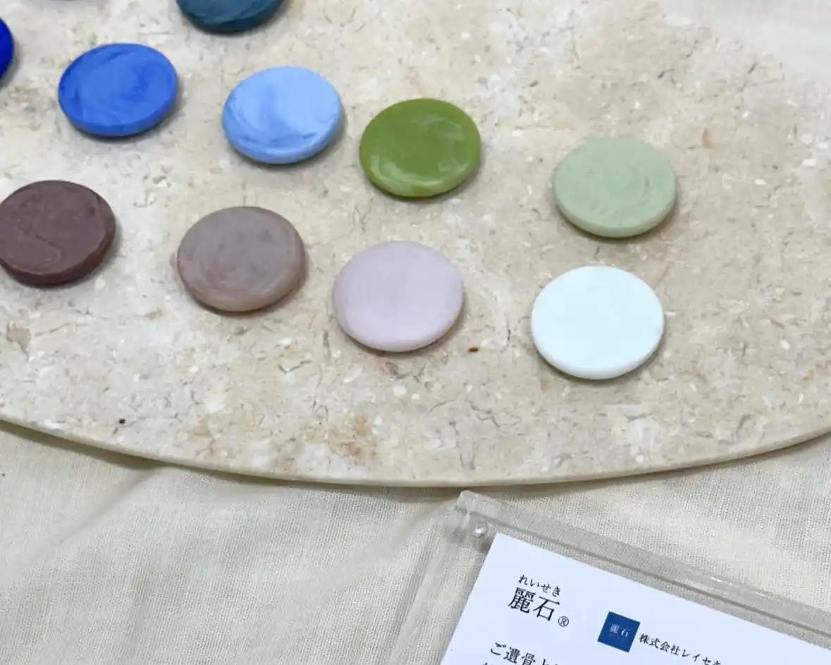 また、ご遺骨から生まれる人工宝石「麗石(れいせき)」を用いたジュエリーは、12色のカラーサンプルを展示。来場者からは「こんなかたちで残せるとは思わなかった」などの声が寄せられ、関心の高さがうかがえました。 |