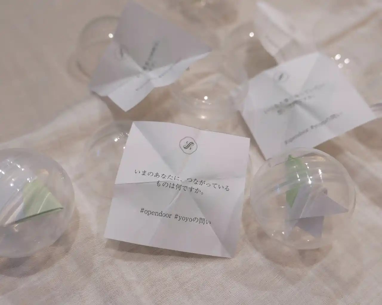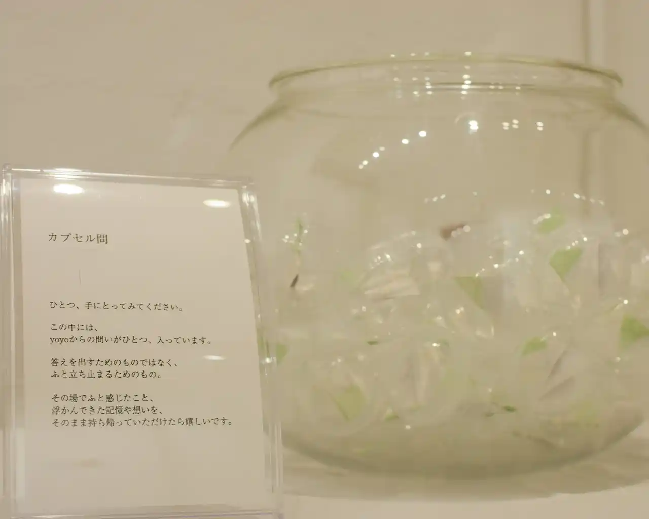 会場には参加型企画「カプセル問(トイ)」を設置し、来場者が”体験”として持ち帰る特別な仕掛けも。ランダムに引いた問いをきっかけに、来場者自身が感情や記憶に向き合う構造としました。カプセルの中に閉じ込めた「問い」は全部で12種類。供養を”考える”のではなく、“自然と考えてしまう”体験を設計しています。会場では、自身のペースで展示や想いと向き合い、それぞれが静かに思考を巡らせる様子が見られました。 |