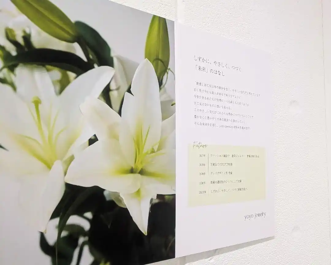 展示の最後では、yoyo jewelryの「これから」を予感させる未来年表を設置。yoyo jewelryは「供養」を大切な存在を想う”やさしい文化”として捉え、その価値がこれからも社会の中で美しく続いていくことを目指しています。目に見えない存在に想いを馳せる時間が日常の中に自然と息づくことで、より豊かで思いやりのある社会へつながっていくと考えています。一方で、従来の供養には「よくわからない」「暗い」「日常から少し遠い」といったイメージが残る側面もあります。yoyo jewelryは、そうしたイメージに対して、デザインや体験の力を通じて新たな選択肢を提示し、より前向きに、自分らしく向き合える供養のあり方を提案していきます。 |