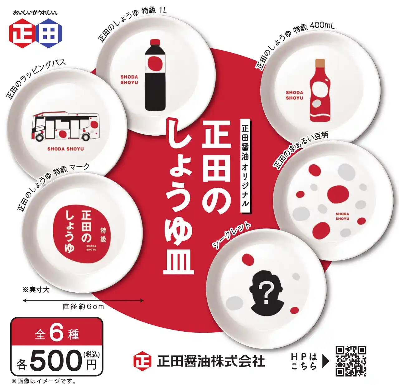 本商品は、美濃焼の伝統技術を用いて製作された、陶器製の豆皿です。しょうゆ皿としての実用性を備えながら、「正田のしょうゆ」の親しみやすさやパッケージの特徴を取り入れた意匠により、日常の食卓や暮らしに楽しさを添えるアイテムとしてご活用いただけます。ラインアップは全6種で、そのうち1種はシークレットデザインとなっており、カプセルトイならではの楽しさを盛り上げます。 |