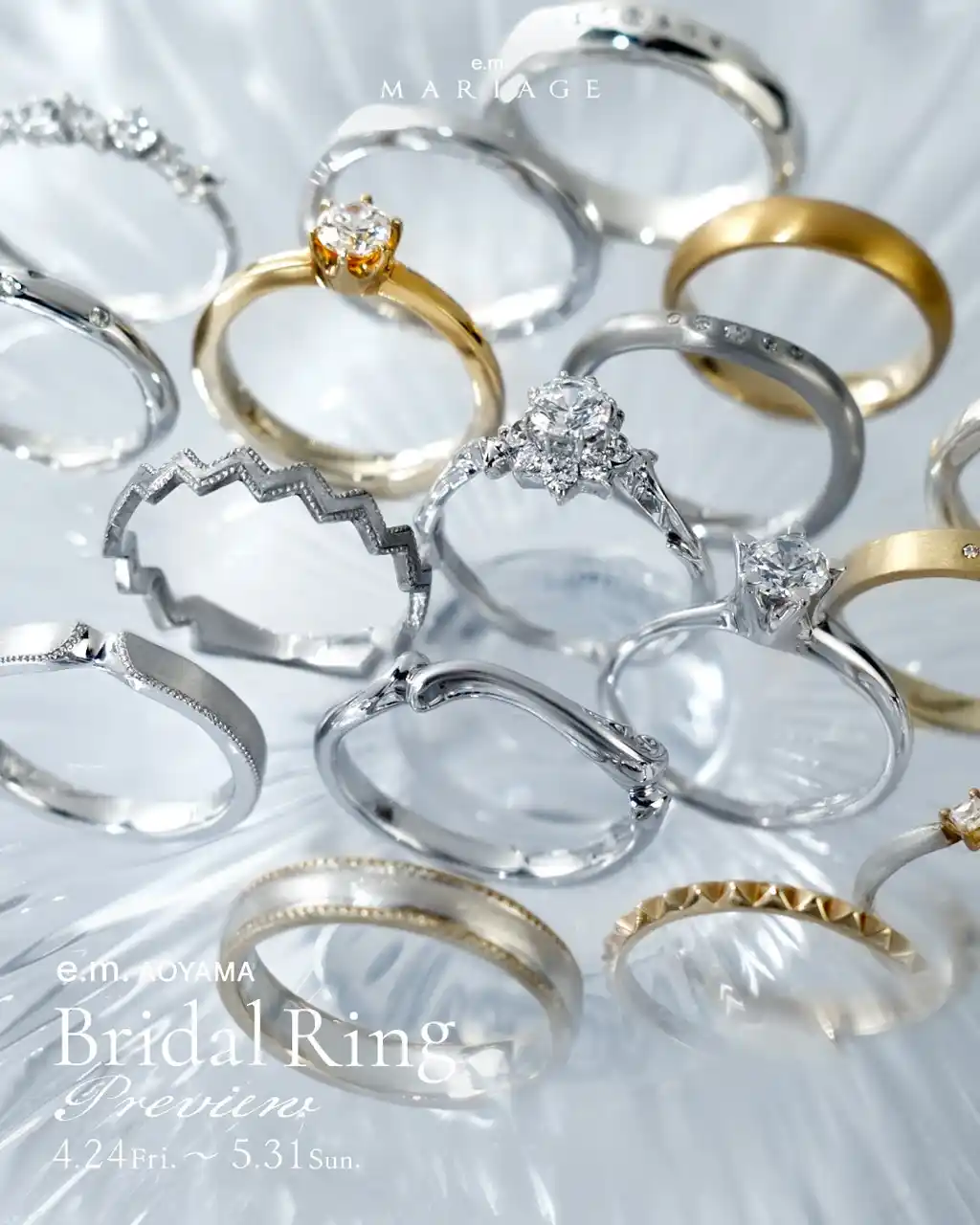 ジュエリーブランド『e.m.』を運営するイー・エム・デザイン株式会社は、2026年4月24日(金)~5月31日(日)の期間中 【Bridal Ring Preview】と題しブライダルライン【e.m.MARIAGE】の試着・相談会を東京・青山のブライダルサロンにて開催します。 |